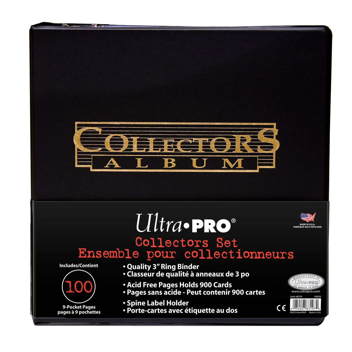 Premium album for standard size pages with collector’s themed hot stamp gold foil on black cover. Reinforced 2″ D-ring with booster for quick loading of pages. Albums include rich foam padding. Constructed with a clear indexing slot on the spine for easy organization. Includes 100 count 9-pocket pages for trading cards.
