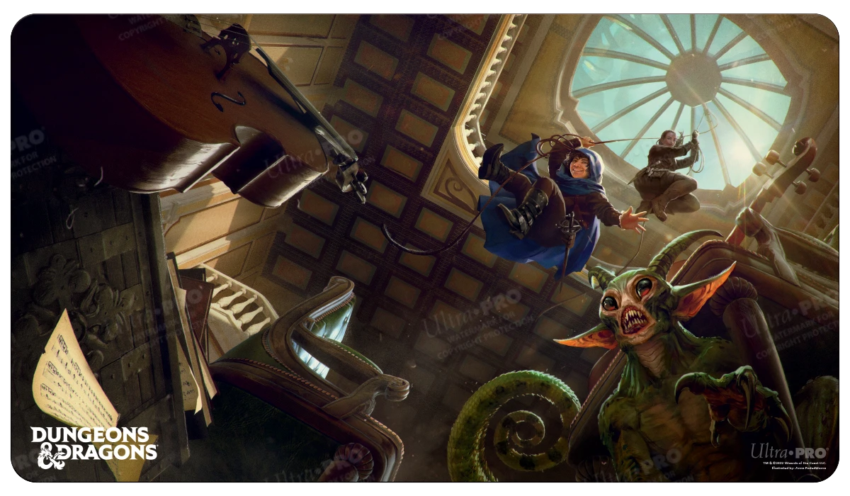 Bring your favorite adventures to the table with the Cover Series Playmats for Dungeons & Dragons. Made with a soft fabric top and rubber backing to protect your cards, miniatures, specialty dice, and game table. With dimensions of approximately 24 in. x 13.5 in., this playmat also serves as the perfect decorative oversized mouse pad for your home or office. Non-slip rubber backing lets the playmat lay flat and prevents it from shifting during use.