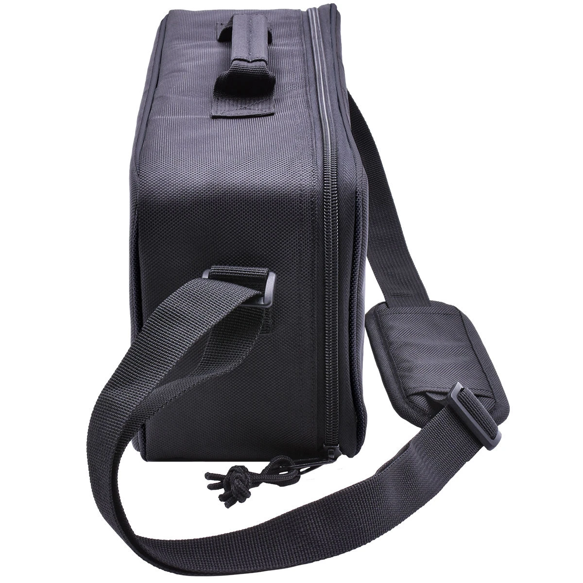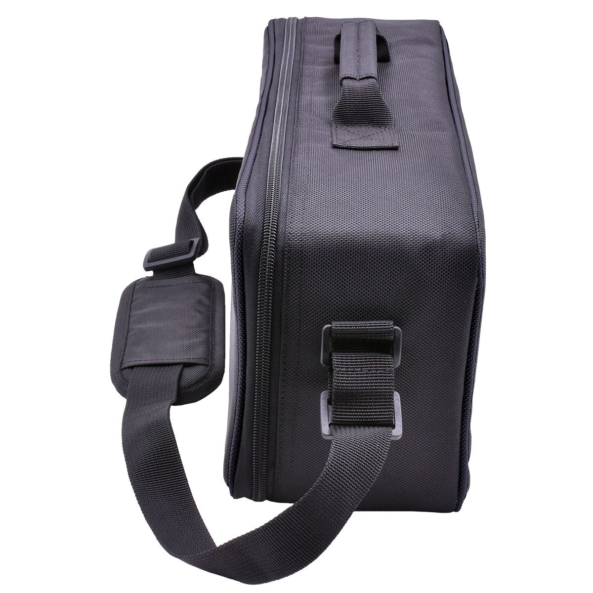 An adjustable padded shoulder strap extends up to 60″ in length, with a top handle for easy carrying.