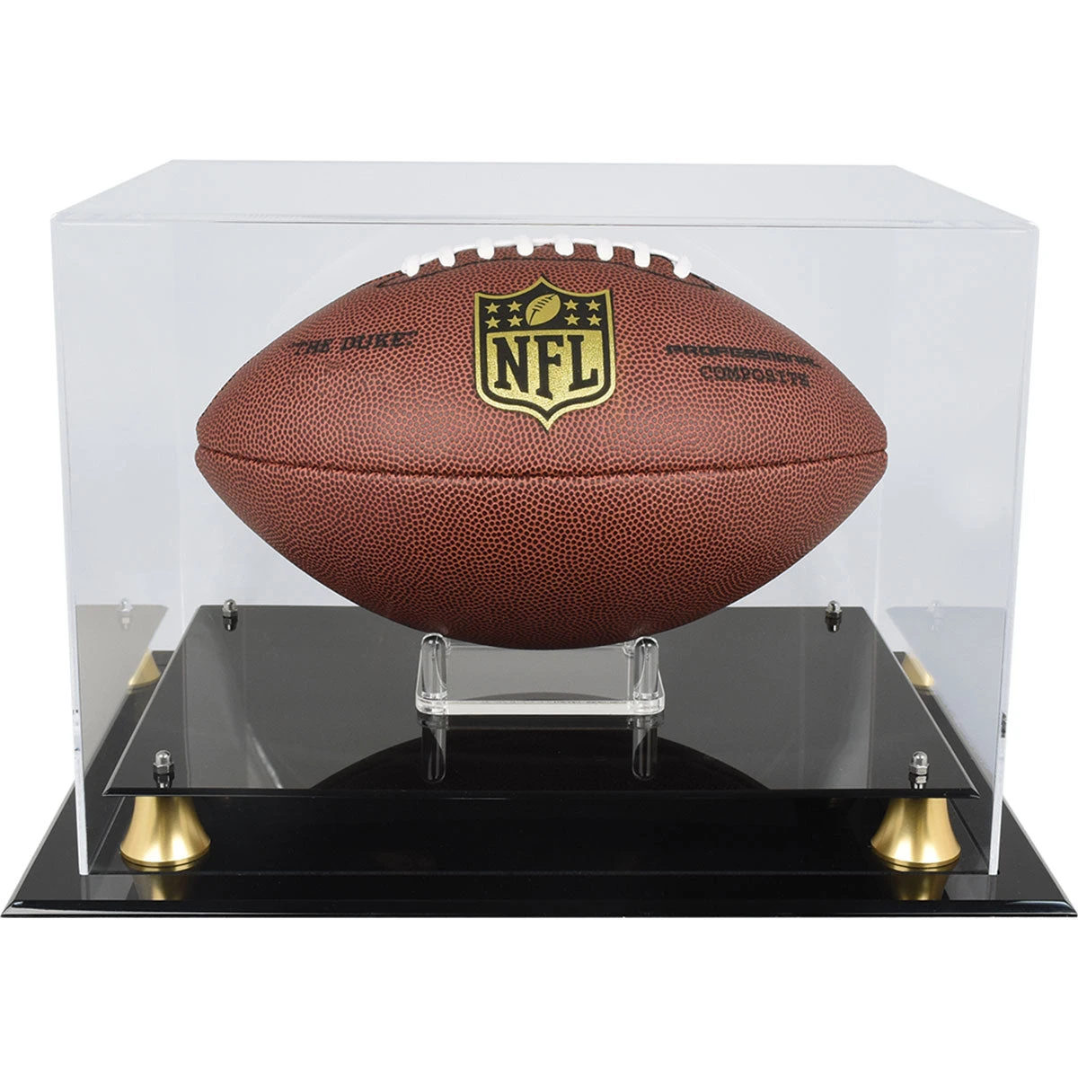 Football Riser Premium Display Cases feature a black acrylic base, premium metal riser in a brushed gold finish, and ultra-clear handmade acrylic cover. Show off your priceless memorabilia while protecting from dust and dirt. The Football Riser Display is sized to hold one (1) regulation size football. Each display includes one ultra-clear acrylic base. The included base can be adjusted to suit multiple angles for optimal display. (football not included) Inner dimensions: 13″ x 9-1/4″ x 8-5/8″ Outer dimensions: 15″ x 11-1/2″ x 11-7/8″