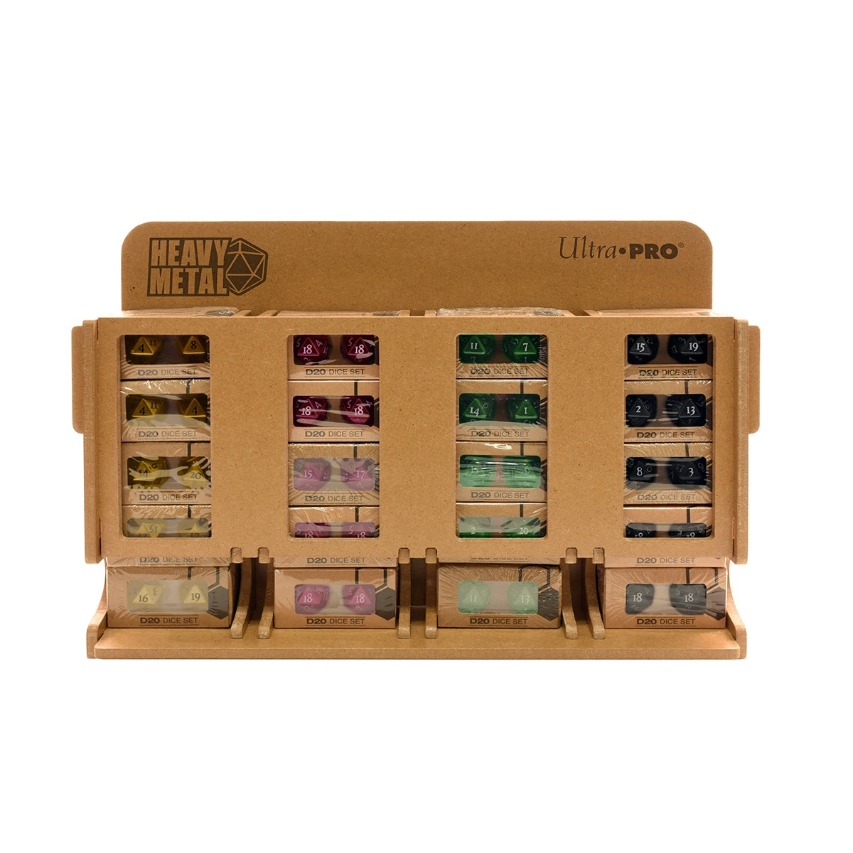 Increase your store’s impulse sales with Ultra PRO’s line of Heavy Metal Dice set. This starter pack comes with an attractive, slim fixture to dispense our popular D20 two-dice packs. The fixture is offered for FREE in this retail starter kit, shipped flat and can be easily constructed by following a few simple steps. This set Heavy Metal Retail Combo Pack includes an assortment of 4 different colors: Black, Pink, Green and Yellow; each color comes with 5 sets as your starting inventory (20 sets total).