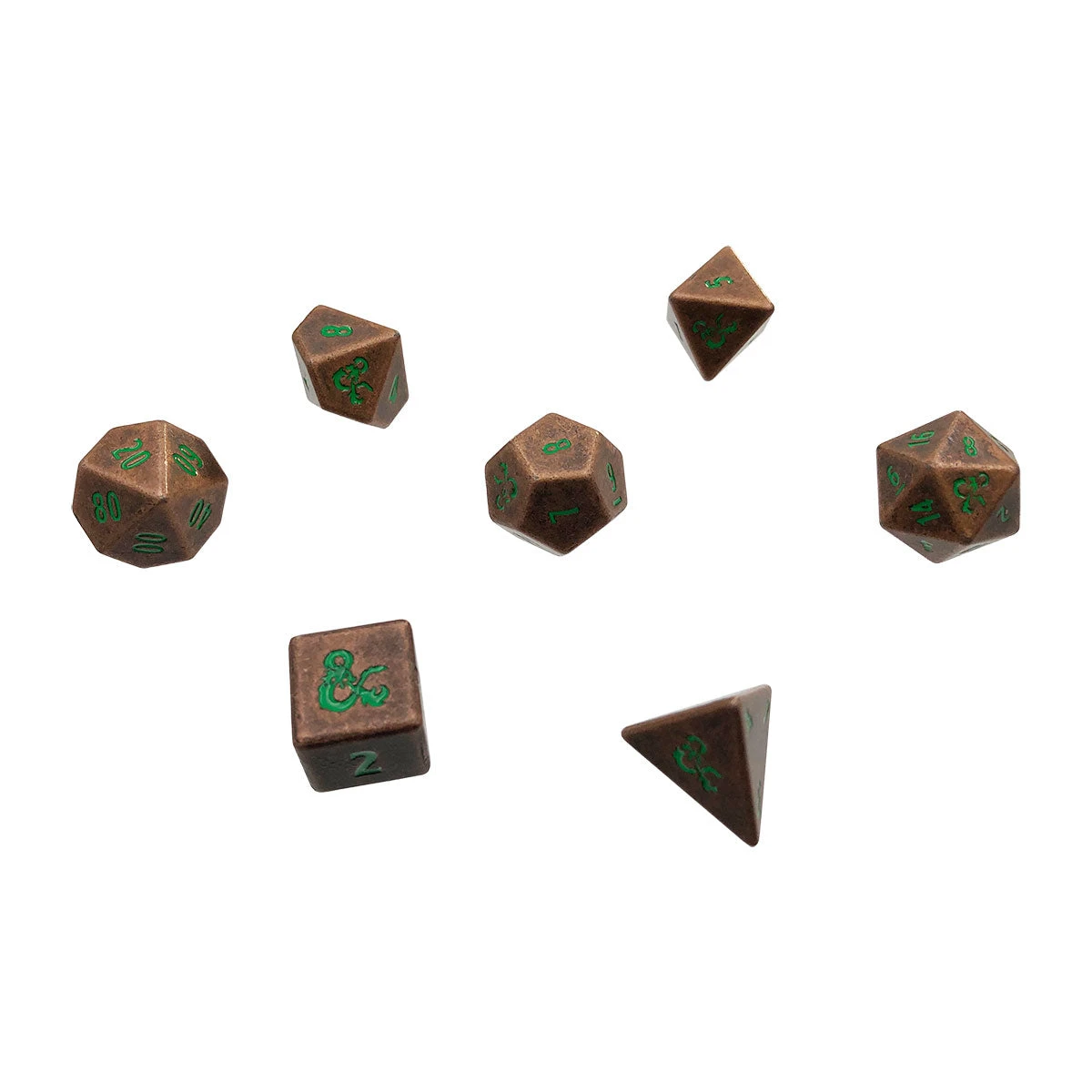 Ward off enemies on your next adventure with the commanding roll of these official Dungeons & Dragons Heavy Metal Feywild Copper and Green RPG dice! Made from the same heavy, zinc alloy material as the Heavy Metal D20 sets, rolling these dice will send a rumble through the realm! The set includes one each: D4, D6, D8, D10, D12, D20, and a Percentile Die – all the dice you need for your next D&D adventure!