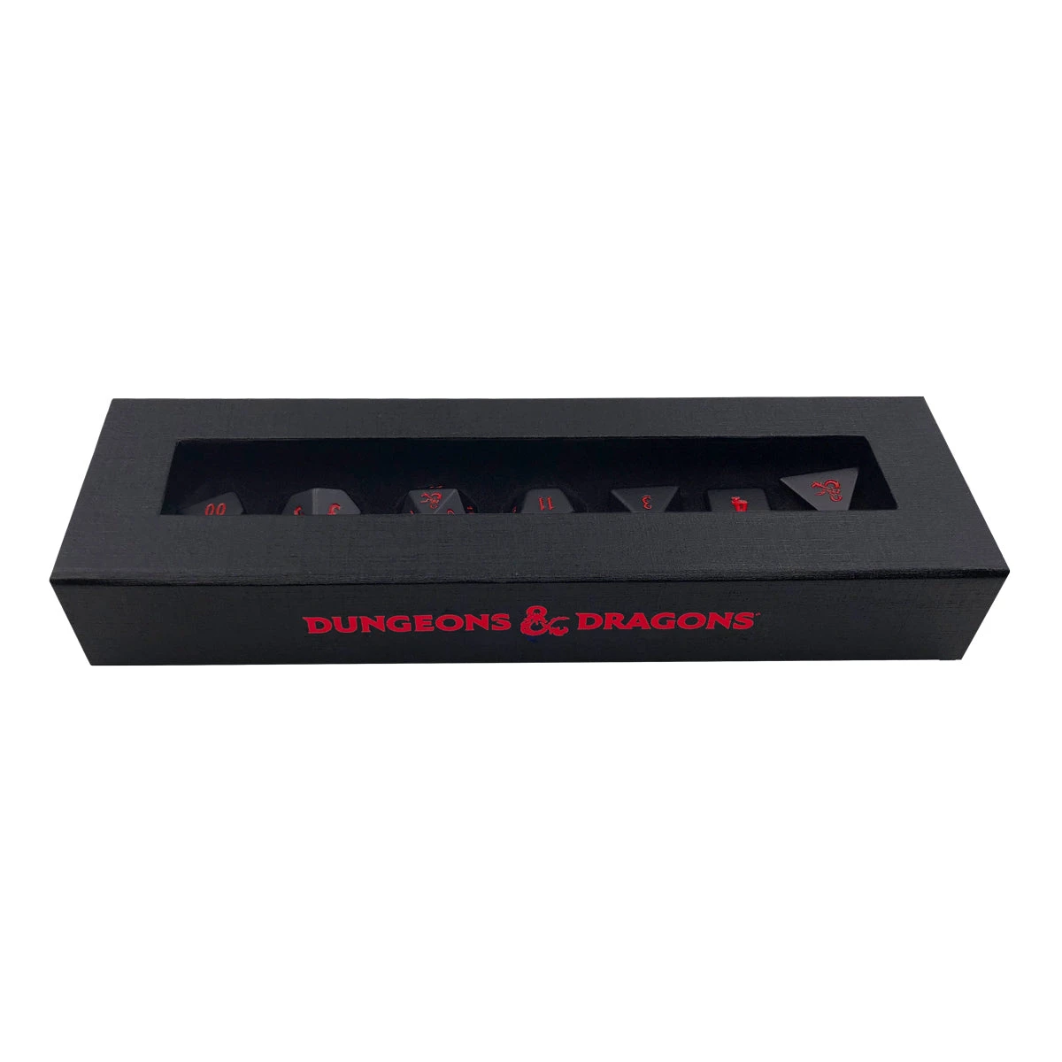 Ward off enemies on your next adventure with the commanding roll of these official Dungeons & Dragons Heavy Metal dice! Made from the same heavy, zinc alloy material as the Heavy Metal D20 sets, rolling these dice will send a rumble through the realm! The set includes one each: D4, D6, D8, D10, D12, D20, and a Percentile Die – all the dice you need for your next D&D adventure!