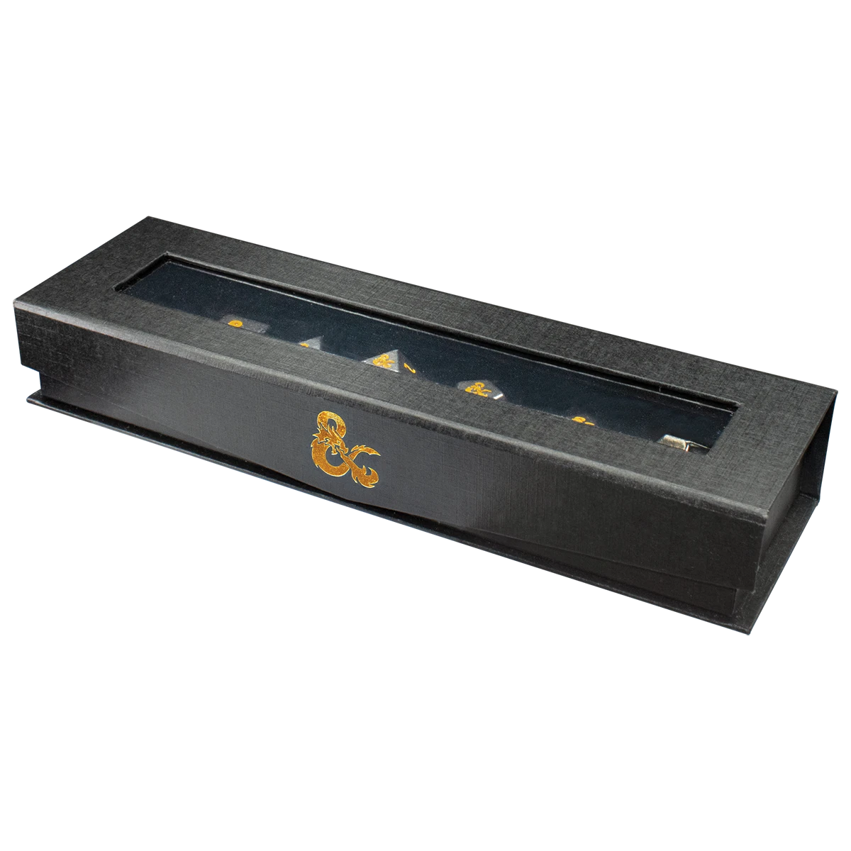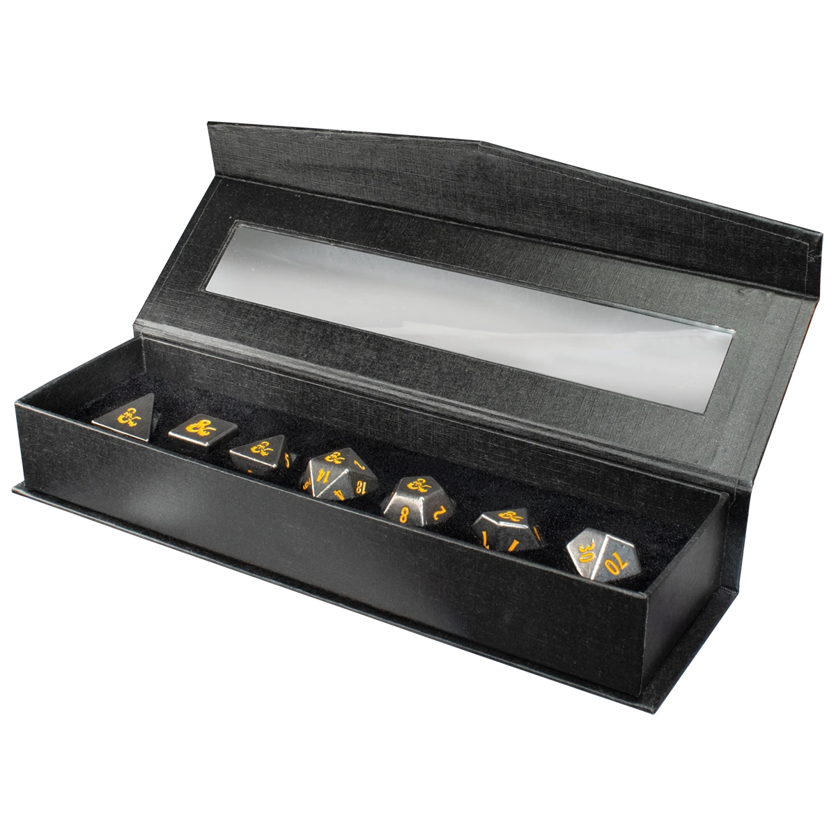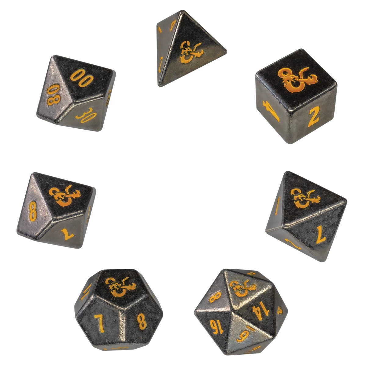 Ward off enemies on your next adventure with the commanding roll of these official Dungeons & Dragons Heavy Metal Dice! Made from the same heavy zinc alloy material as the Heavy Metal D20 sets, rolling these dice will send a rumble through the realm! This set includes seven total dice, one each: D4, D6, D8, D10, D12, D20, and a Percentile Die – all the dice you need for your next D&D adventure!