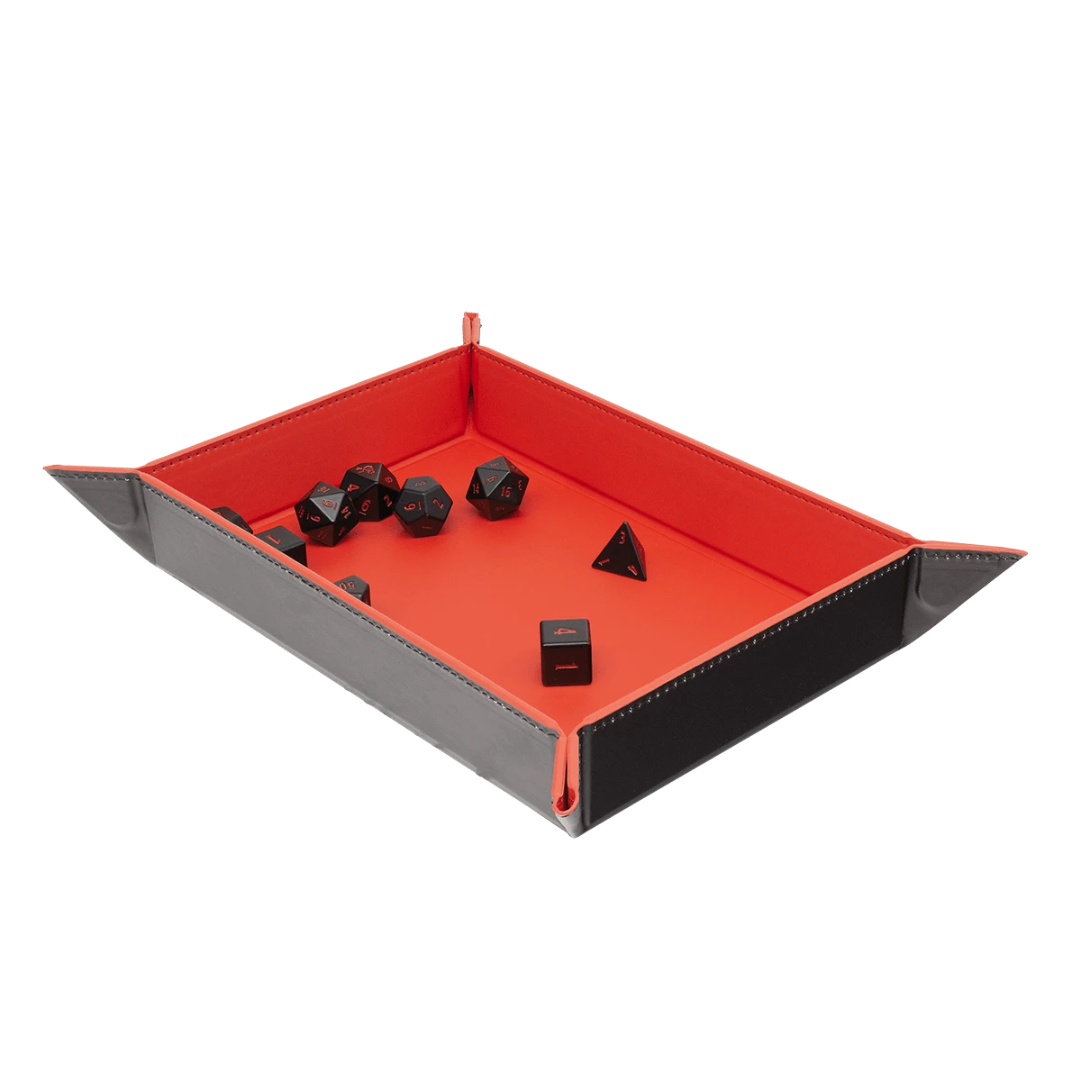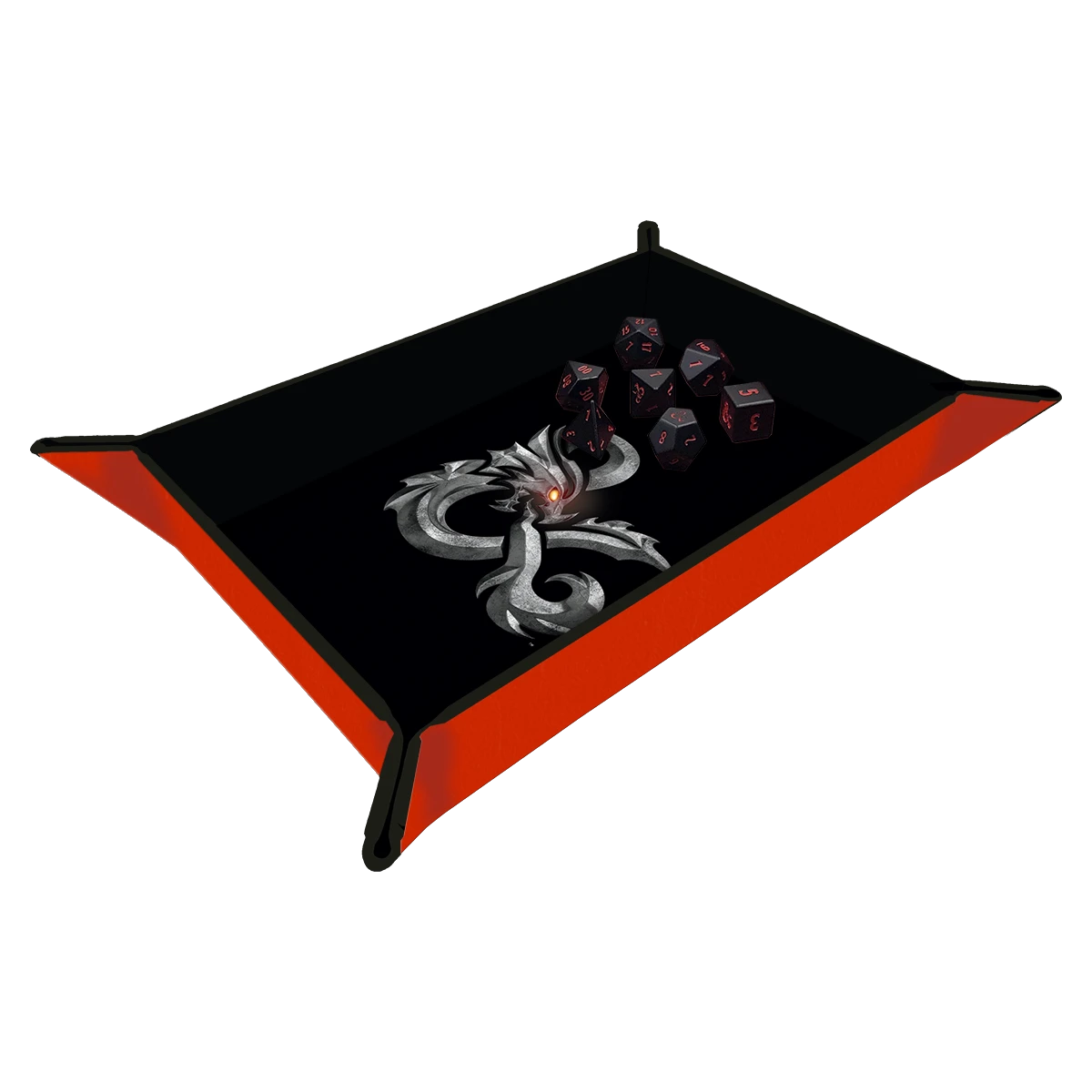 Printed Leatherette Foldable Dice Tray for Dungeons & Dragons offer a safe and aesthetic space for rolling dice. These trays are no bigger than a sheet of paper (8.5 in. x 11 in.) when flat, and utilize small magnets in each corner to easily pop up walls to keep dice under control when rolling. Store your dice rolling tray easily in your backpack, character folio, binder, or favorite board game box. With one side a printed leatherette material, and the other featuring a solid leatherette, there is a dice rolling tray for every gamer.