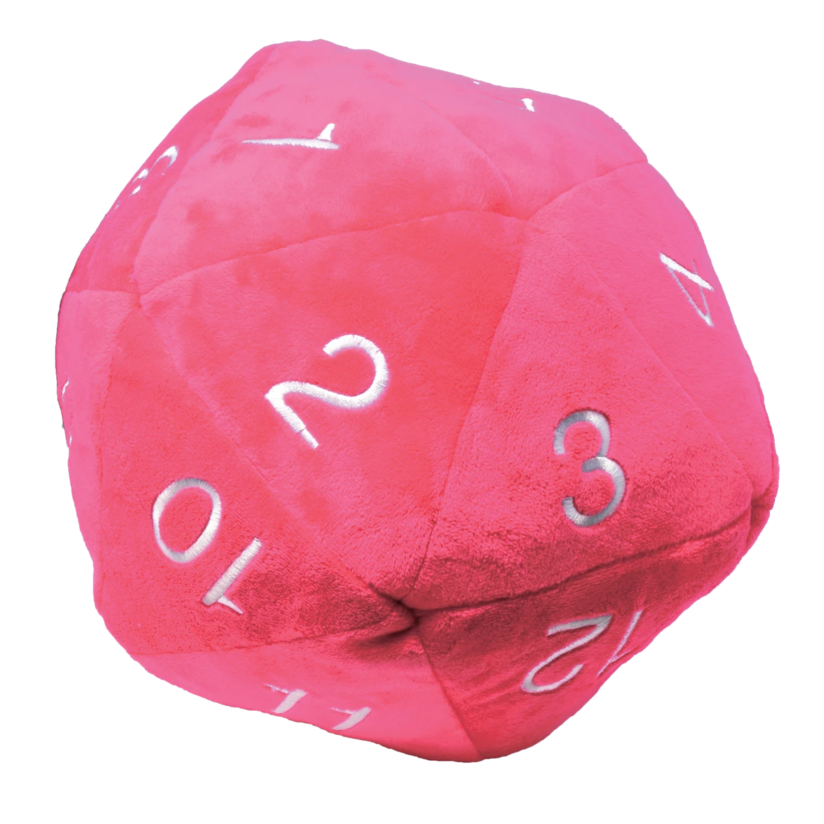 Roll big or go home! Made with an ultra-soft, fuzzy hot pink fabric with stitched white numbers, this Jumbo D20 is soft enough to cuddle or toss. With an approximately 10 in. diameter and reinforced felt backing to help retain its shape, this stuffed toy is great for kids and adults alike!
