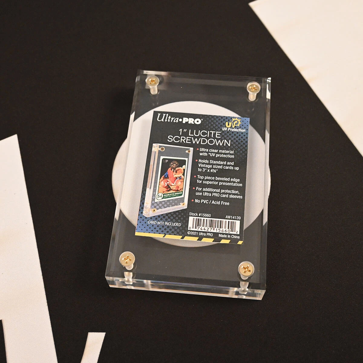 1″ thick non-recessed holder designed to hold standard cards, small photographs, and vintage cards up to 3″ x 4-3/8″. Superior quality Lucite slabs with four-screw closure on each corner and beveled edges for a premium look. Lucite has special additives to protect your valuables from harmful UV rays. Recommended for use with Ultra PRO sleeves to maintain archival safety. Can be displayed vertically or horizontally.