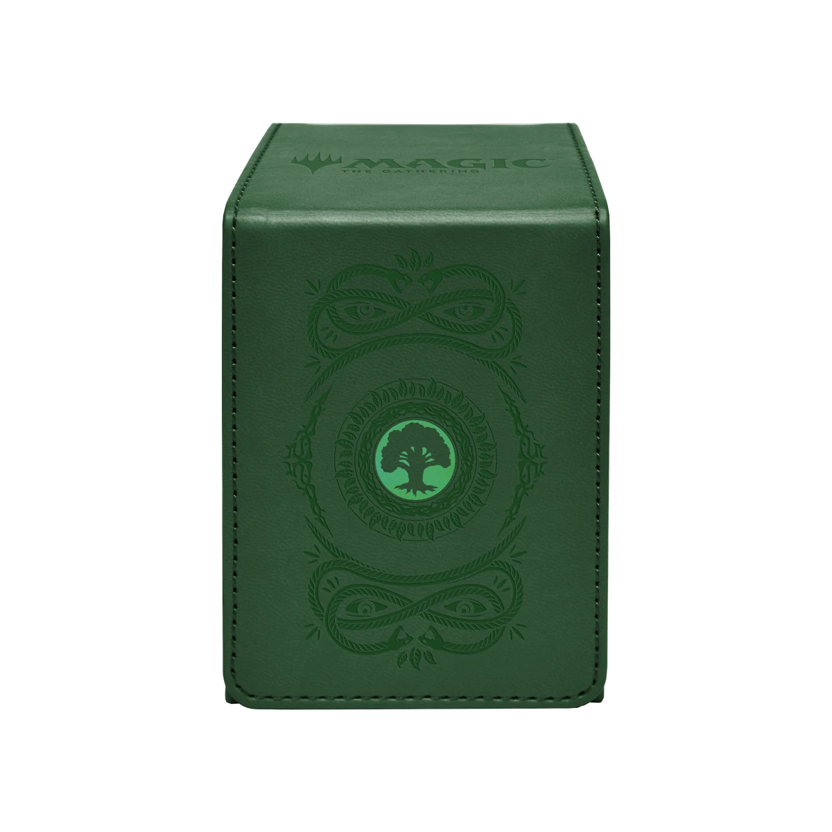 The Mana 7 Forest Alcove Flip Deck Box® for Magic: The Gathering features a vibrant, full-color leatherette finish with a stylized debossed design and spot mirror foil accents. The strong magnetic closure provides secure storage while the dual thumb notches allow for easy access to your deck. This Deck Box® holds up to 100 standard size trading cards double-sleeved in Ultra PRO Deck Protector® sleeves.