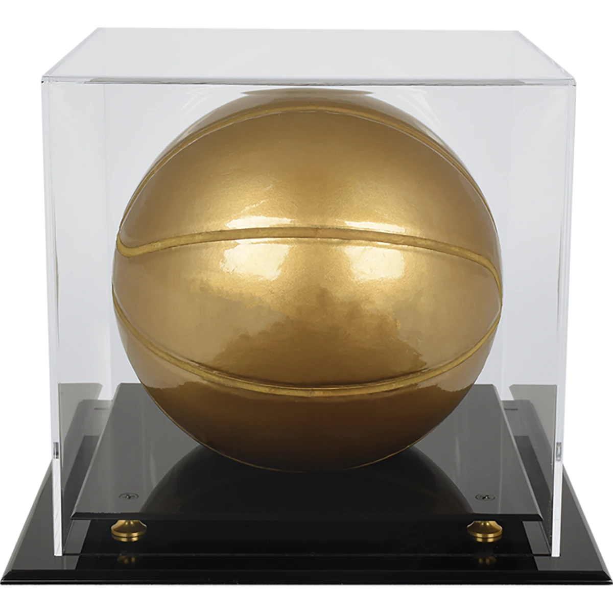 Riser Displays feature a black acrylic base, premium metal riser in a brushed gold finish, and ultra-clear handmade acrylic cover. Show off your priceless memorabilia while protecting from dust and dirt. The Mini Riser is sized to hold one (1) mini basketball. Also great for displaying baseball, football, or hockey mini helmets. Each display case comes with a clear ring stand to hold a ball in place. This case is also ideal for displaying collectible baseball, football, or hockey mini helmets. (ball and helmet not included) Inner dimensions: 8″ x 8″ x 7-1/2″ Outer dimensions: 9-3/4″ x 9-3/4″ x 9-5/8″