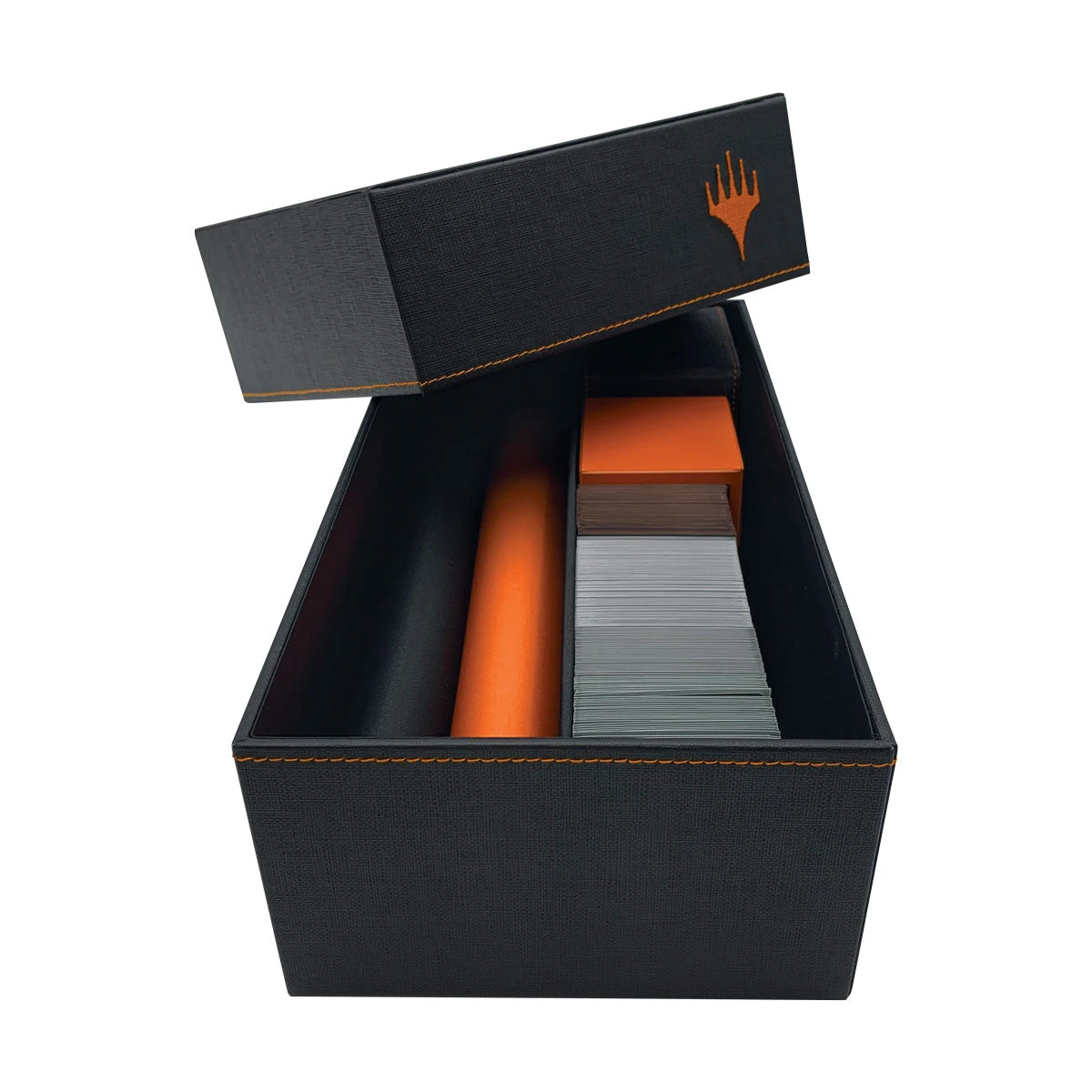 The Mythic Editions are Ultra PRO’s most premium accessories for Magic: The Gathering. This Collection Cache Storage Box features a black leatherette material with a mythic orange embroidered Planeswalker symbol and matching stitching. The two-piece box features two channels sized to store and protect trading cards in sleeves and toploaders, Satin Cube and Alcove Flip deck boxes, and even rolled playmats! Holds up to: