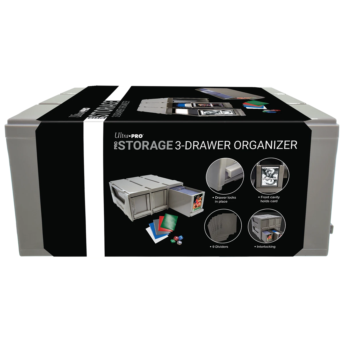 UPgrade your card storage with the PRO-Storage 3-Drawer Organizer by Ultra PRO. With 3 spacious drawers to accommodate cards stored in sleeves, toploaders, ONE-TOUCH, or otherwise unprotected, the rigid polypropylene materials are acid-free and non-PVC for premium storage. Take advantage of a snap-fit lid and removable drawers, allowing you to easily access all three drawers from an open-top or bring one drawer to the table at a time. For further organization, this organizer includes 9 matching card dividers and a front display slot on each drawer sized to fit a standard size trading card. With outer dimensions of 12.96 in. x 5.95 in. x 13.5 in. and a recessed base, these organizers stack safely and store easily in most standard shelving systems.
