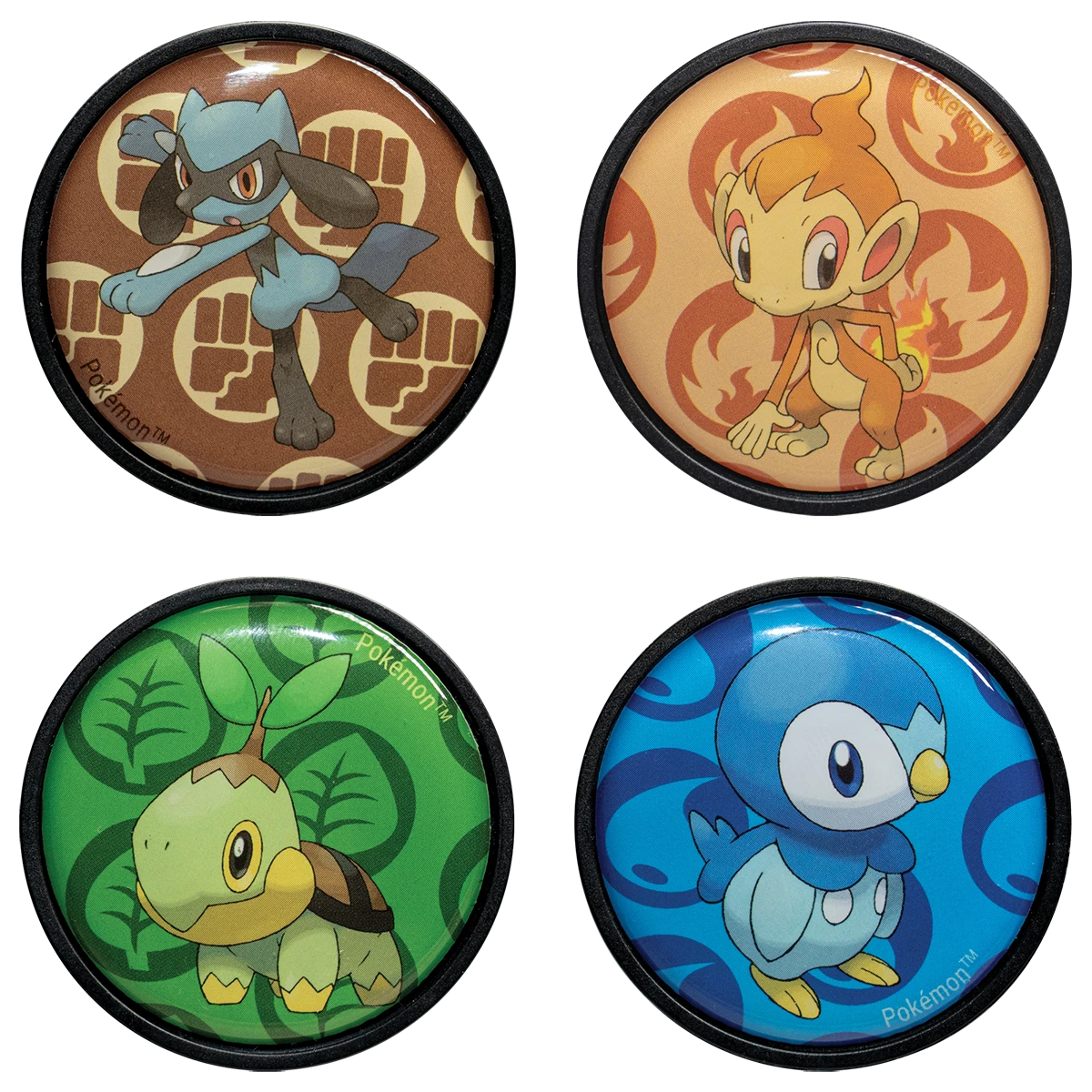 - Comes with four 1.5 in. magnetic badges, featuring Chimchar, Turtwig, Piplup, and Riolu