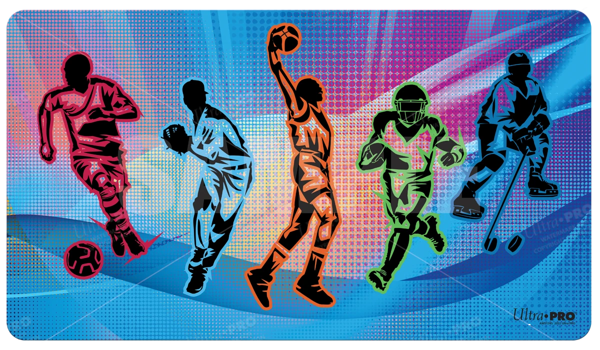 The Silhouette Breaker Mat Mousepad features a retro style design with silhouette sports players of soccer, baseball, basketball, football, and hockey. Made with a premium fabric top to prevent damage to cards during card breaks, pack opening, and card sorting. With dimensions of approximately 24 in. x 13-½ in., this Breaker Mat Mousepad is also the perfect decorative oversized mouse pad for computer and laptop workstations. Non-slip rubber backing lets the Breaker Mat Mousepad lay flat and prevents it from shifting during use.
