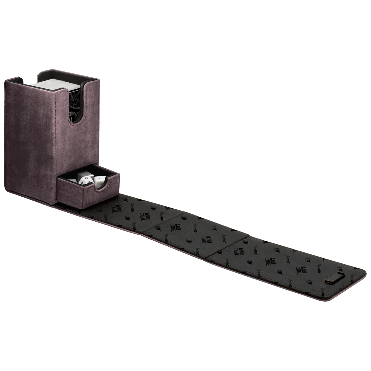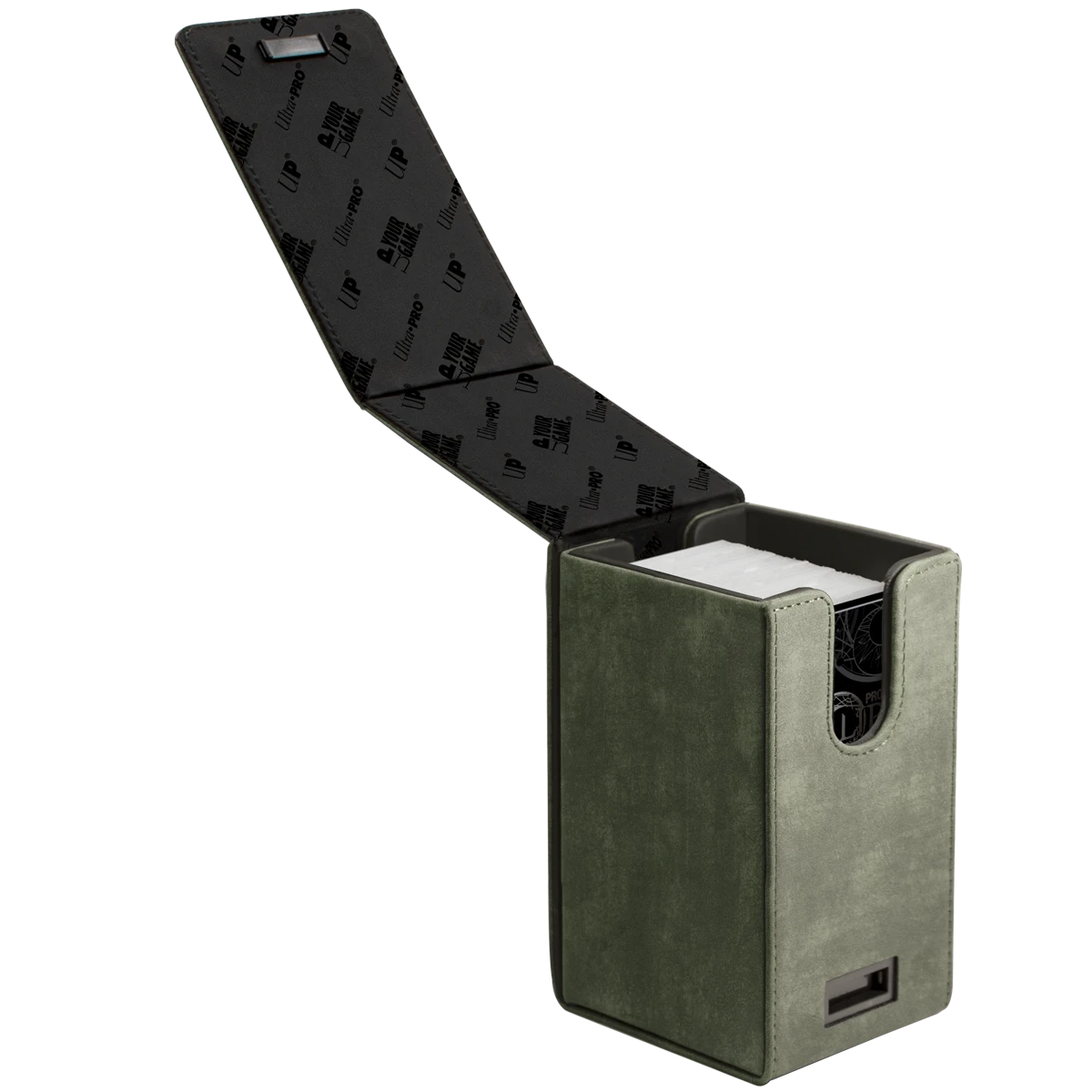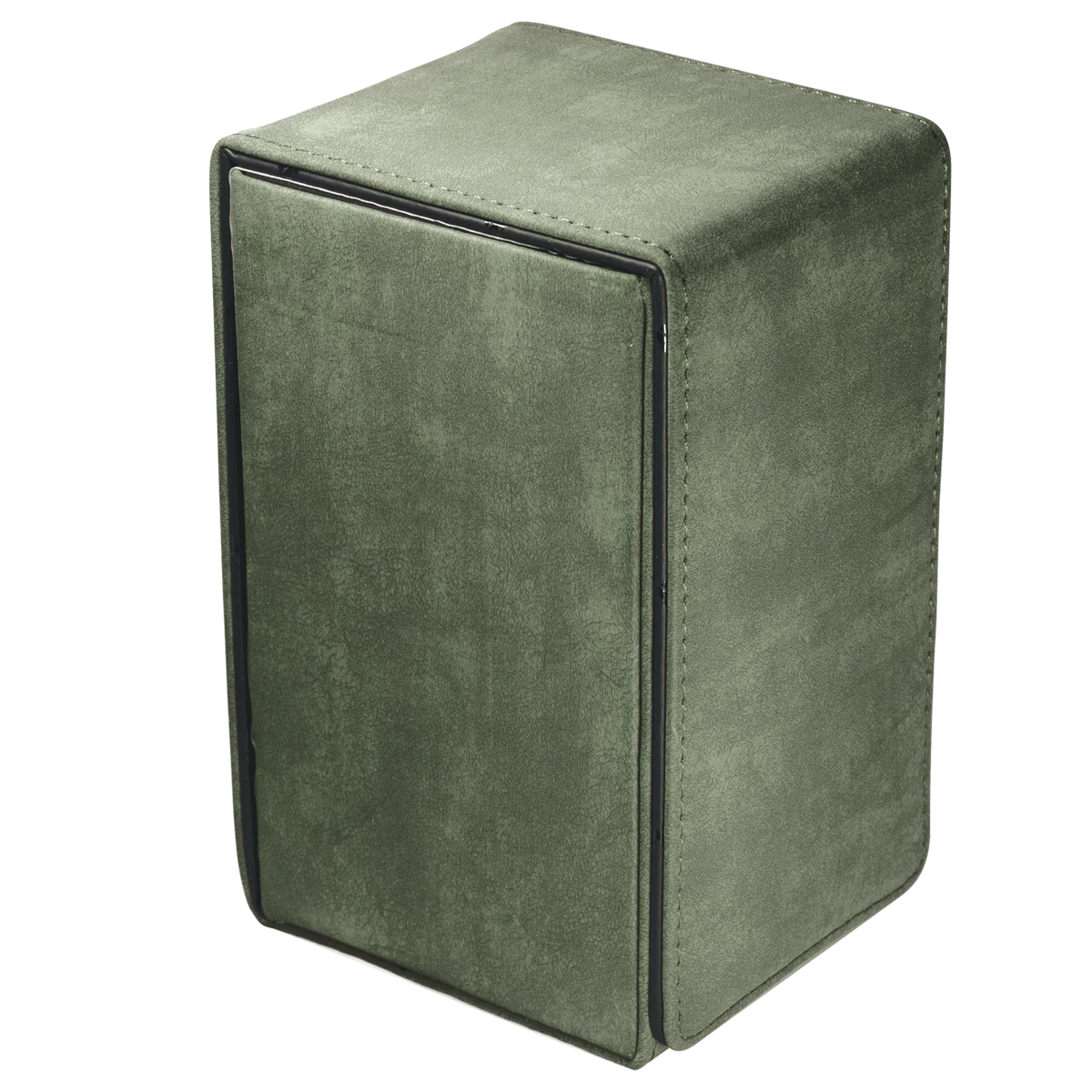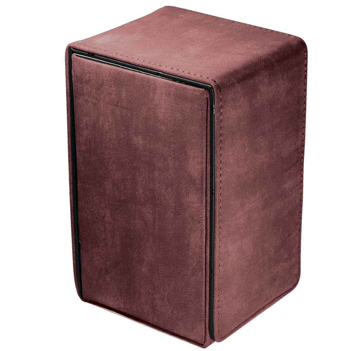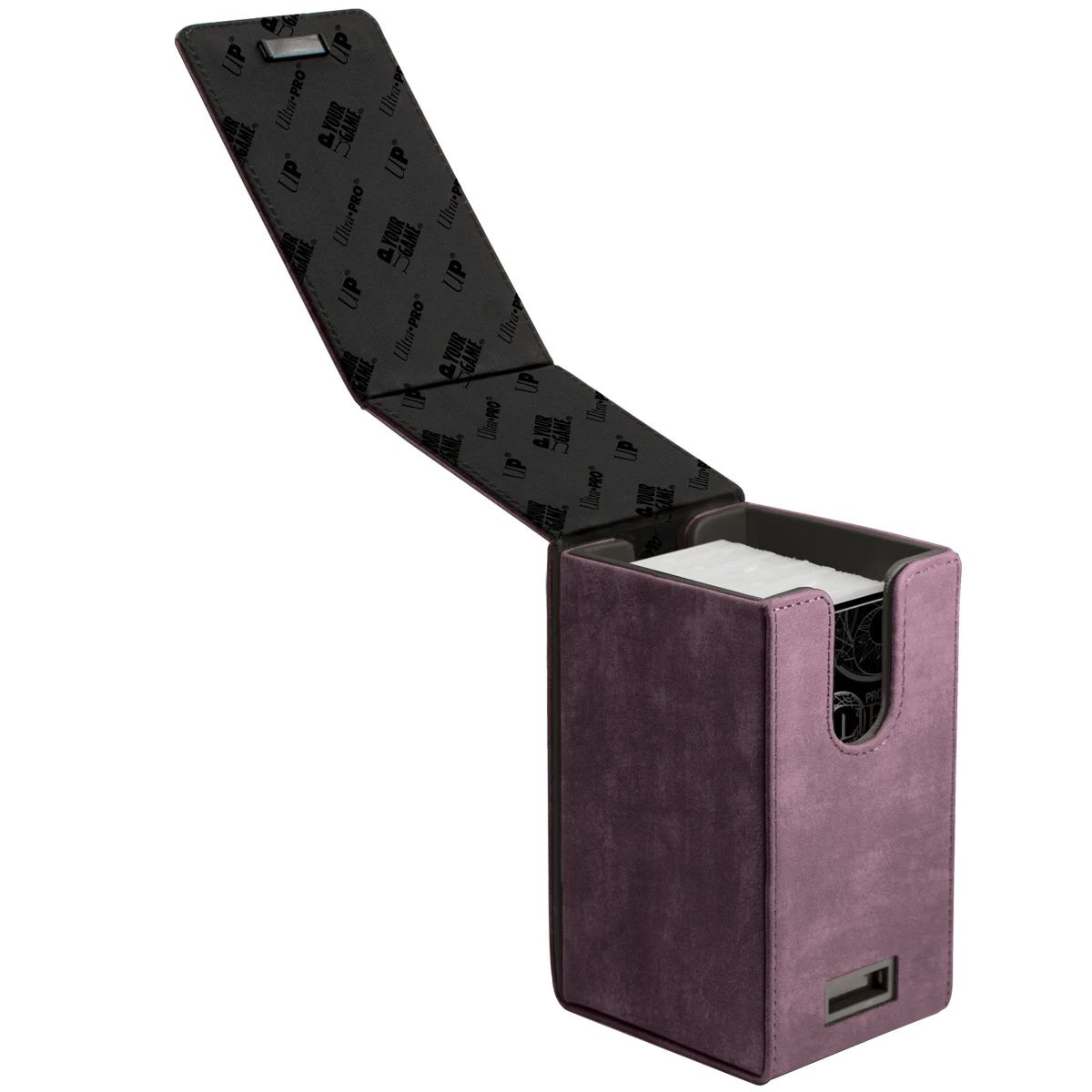 Premium Alcove Tower Flip Deck Box storage cases made with a suede-like material. The Alcove Tower can hold up to 100 double sleeved cards with its lid secured by strong magnetic closures utilizing multiple magnets for extra protection. The lid can be undone on both sides of the box to reveal dual thumb notches for easy access to your deck of cards. The Alcove Tower is a great storage device for organizing and protecting your collection.