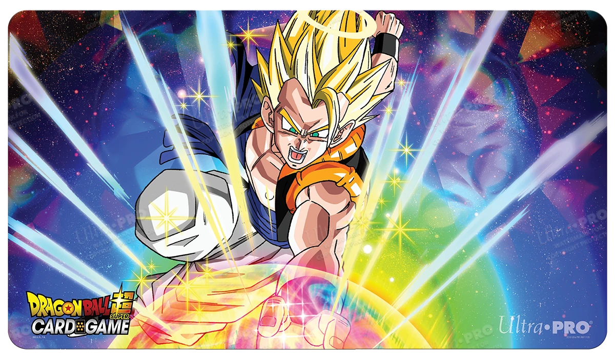 Harness the true power of a Super Saiyan with this official Dragon Ball Super playmat featuring Super Saiyan God SS Gogeta! Made with a premium fabric top to prevent damage to cards during game play for tabletop gamers. With dimensions of approximately 24″ X 13-1/2″, this playmat is also the perfect decorative over sized mouse pad for computer and laptop workstations. Non-slip rubber backing lets the playmat lay flat and prevents it from shifting during use. Perfect for use with the Dragon Ball Super Trading Card Game. Produced by Ultra PRO in partnership with BANDAI CO., LTD. This playmat comes with a bonus premium playmat tube.