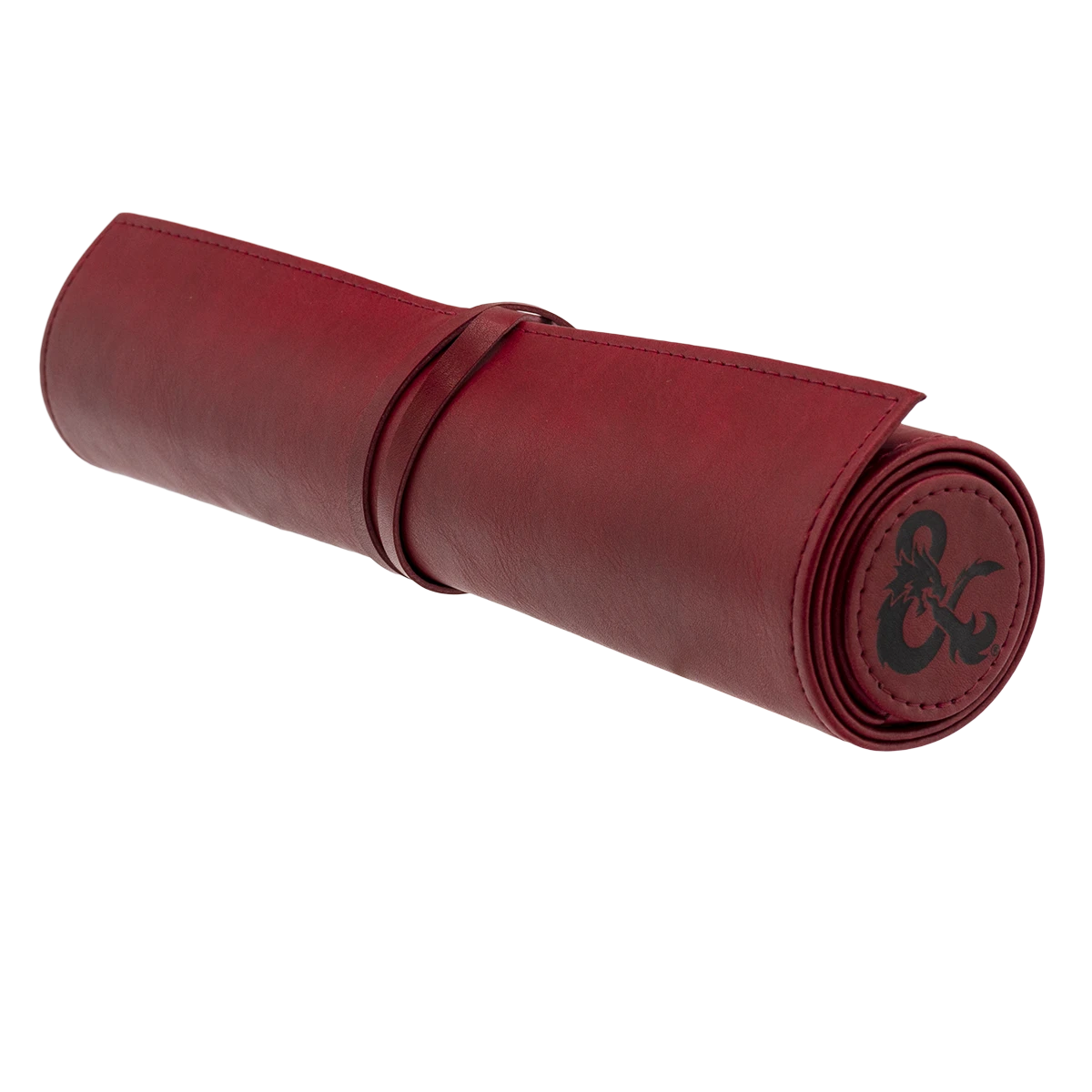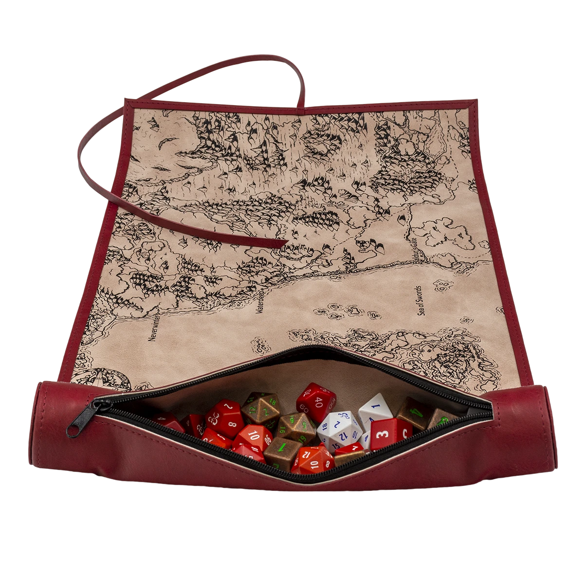 The D&D Dice Scroll Map offers premium dice storage and functions as a dice rolling mat. This Sword Coast Map, illustrated by Deven Rue, is made with a durable Burgundy Red leatherette exterior and a cream-colored backing for the map on the rolling surface with D&D ampersands on each end. This soft roll-out mat will safely store your dice and protect your table. The zippered compartment holds 20+ dice. The rolling mat rolls around the zippered compartment and is secured shut with a single tie to look like an ancient leather-bound scroll. (Dice not included)